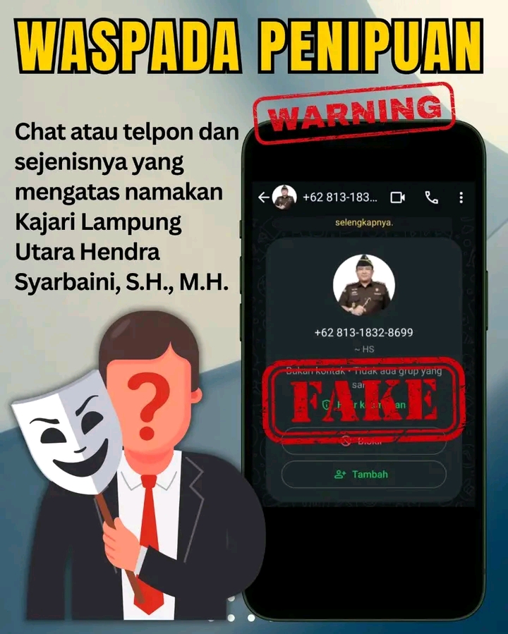 Nomor dengan identitas +62 813-1832-8699 yang mencatut nama dan foto beliau dipastikan palsu dan bukan milik Hendra Syarbaini maupun pihak Kejaksaan Negeri Lampung Utara.