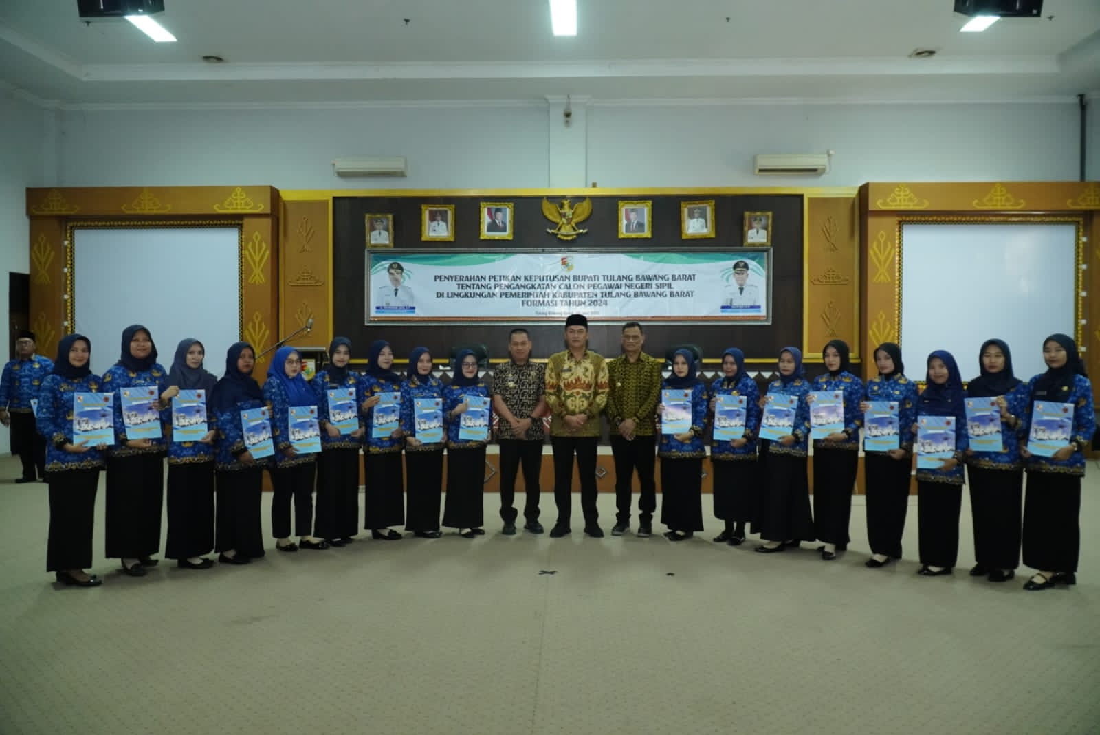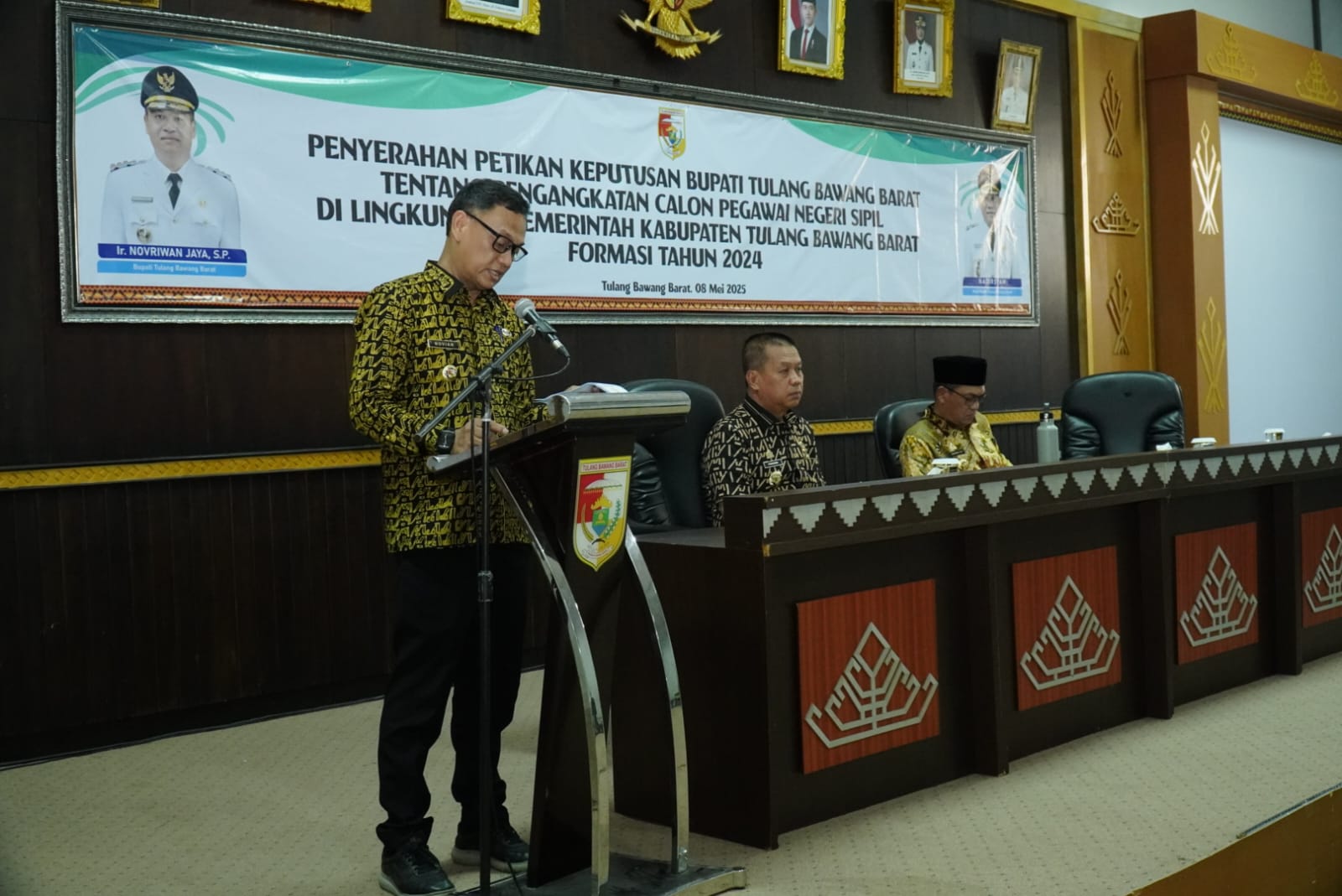 TUBABA,BN – Bupati Tulangbawang Barat (Tubaba) Ir. Novriwan Jaya, S.P. menyerahkan Surat keputusan pengangkatan Pegawai Negeri Sipil (PNS) formasi tahun 2024 dan surat pengangkatan CPNS tahun 2025 Formasi Lulusan STTD di Lingkup Pemkab Tubaba.