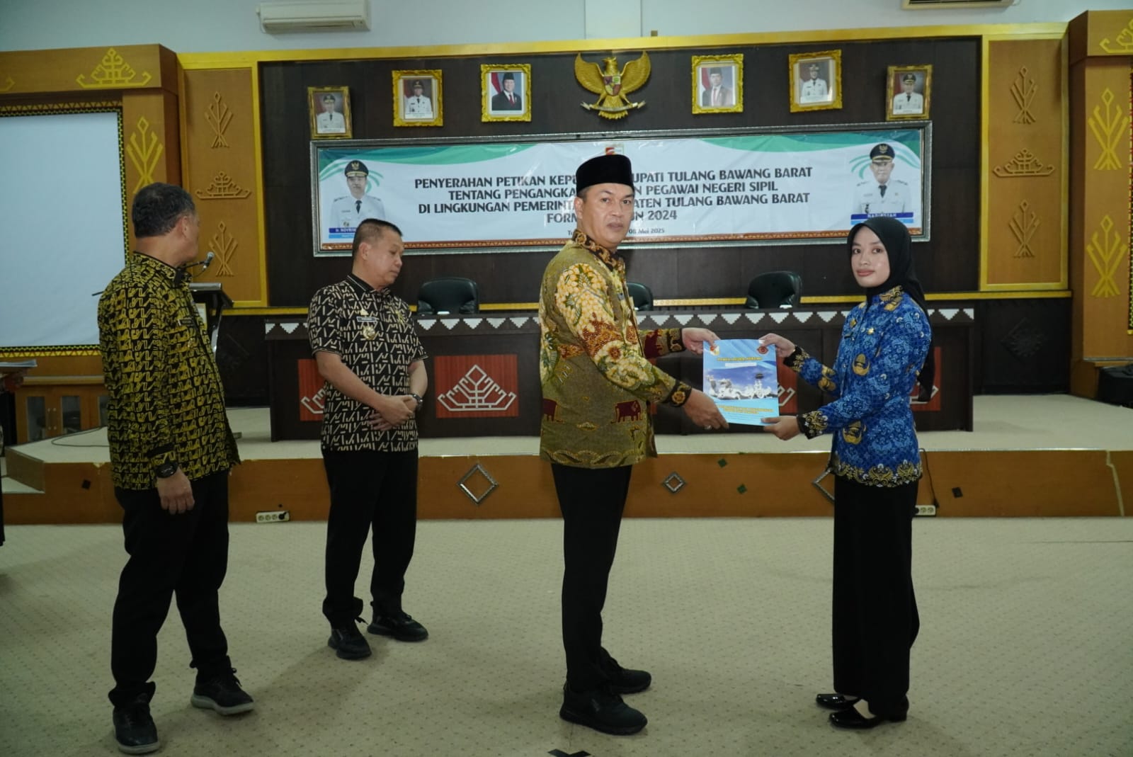 TUBABA,BN – Bupati Tulangbawang Barat (Tubaba) Ir. Novriwan Jaya, S.P. menyerahkan Surat keputusan pengangkatan Pegawai Negeri Sipil (PNS) formasi tahun 2024 dan surat pengangkatan CPNS tahun 2025 Formasi Lulusan STTD di Lingkup Pemkab Tubaba.