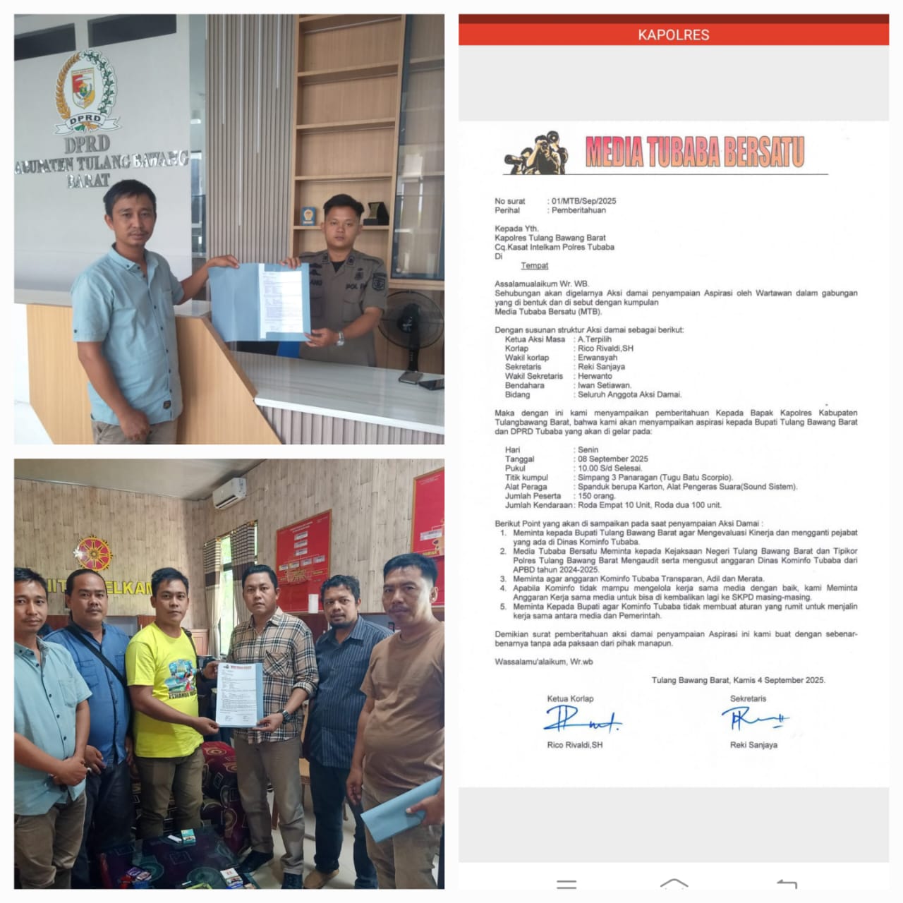 Hal senada juga di sampaikan Reki Sanjaya seketaris media Tubaba Bersatu menyatakan bahwa terkait jadwal Aksi Damai tersebut pihaknya sudah melayangkan surat tembusan secara resmi kepada Polres, Kejari, DPRD Dinas kominfo, Bupati tubaba.