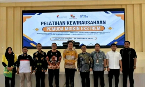 KOTABUMI – Kementerian Pemuda dan Olahraga (Kemenpora) bekerja sama dengan Pemerintah Kabupaten Lampung Utara menggelar Pelatihan Kewirausahaan Pemuda Miskin Ekstrem dengan tema “Wirausaha Muda Mandiri, Indonesia Tangguh: Pengentasan Kemiskinan Melalui Pengembangan Kewirausahaan Pemuda Berbasis Sumber Daya Lokal”. Kegiatan berlangsung di Gedung Pusiban Agung, Kamis (30/10/2025).