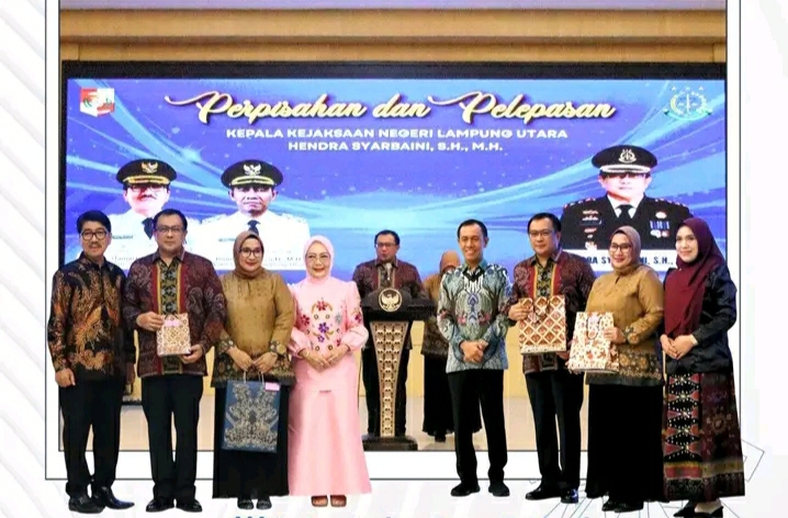 KOTABUMI – Bupati Lampung Utara Dr. Ir. H. Hamartoni Ahadis, M.Si bersama Wakil Bupati Romli, S.Kom., S.H., M.H. menghadiri acara perpisahan dan pelepasan Kepala Kejaksaan Negeri Lampung Utara, Hendra Syarbaini, S.H., M.H., yang mendapat amanah baru sebagai Asisten Tindak Pidana Khusus Kejaksaan Tinggi Bengkulu. Acara berlangsung di Gedung Pusiban Kotabumi, Kamis 30 Oktober 2025.